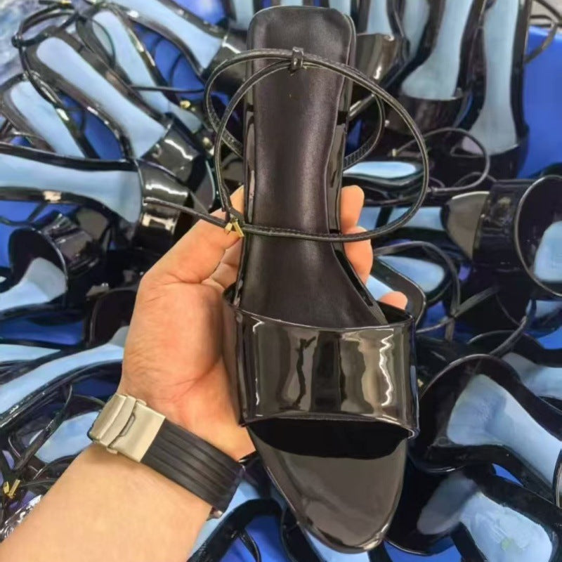 Women's 2025 New Fashion Joker Patent Leather Effect Small Round Head Strap High-heeled Sandals.