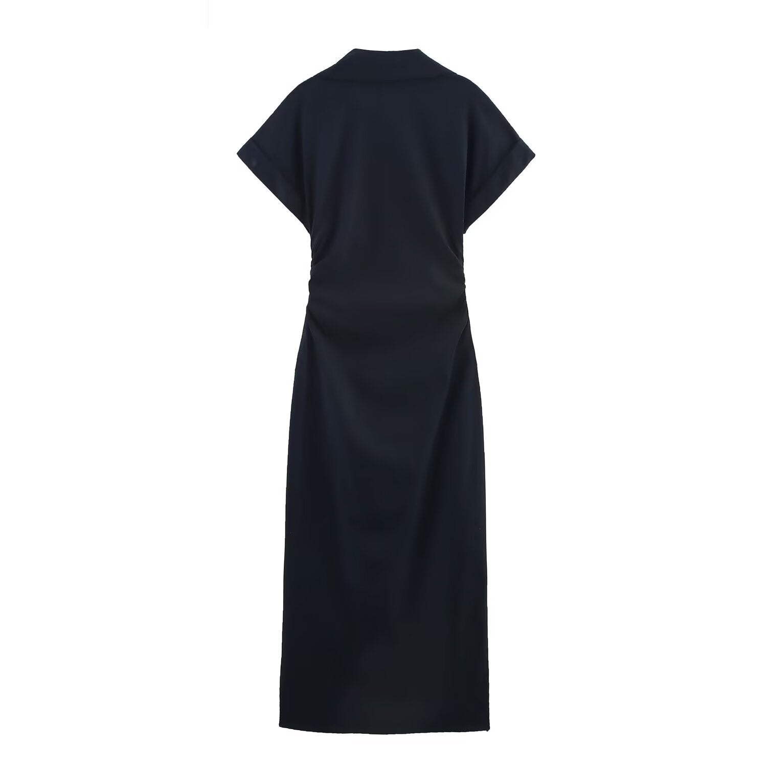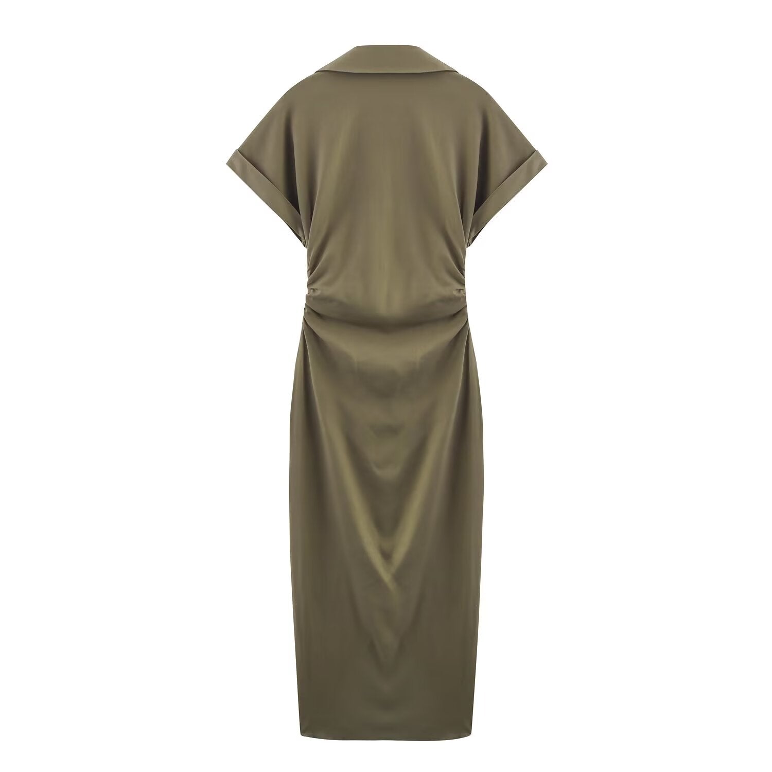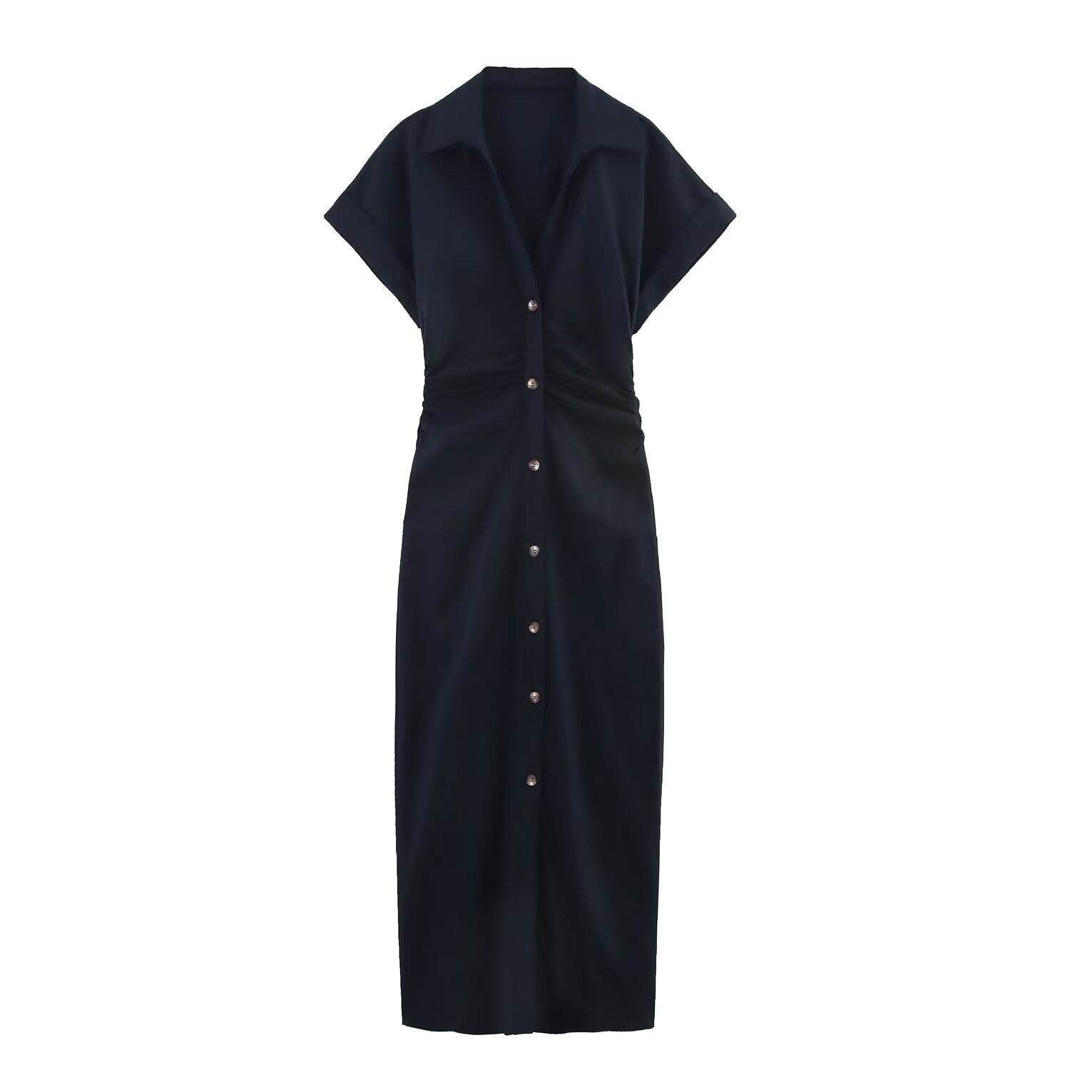 Women's new chic fashion pleated decoration slim single breasted linen blended MIDI dress retro short sleeved women's dress