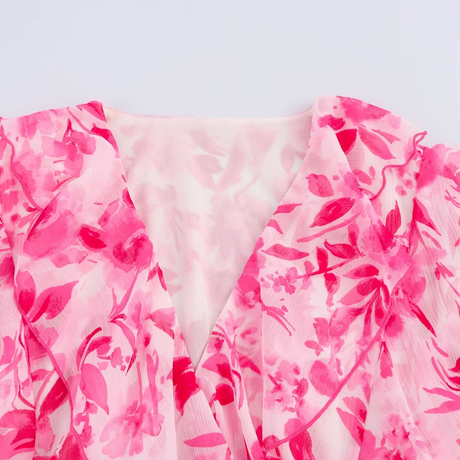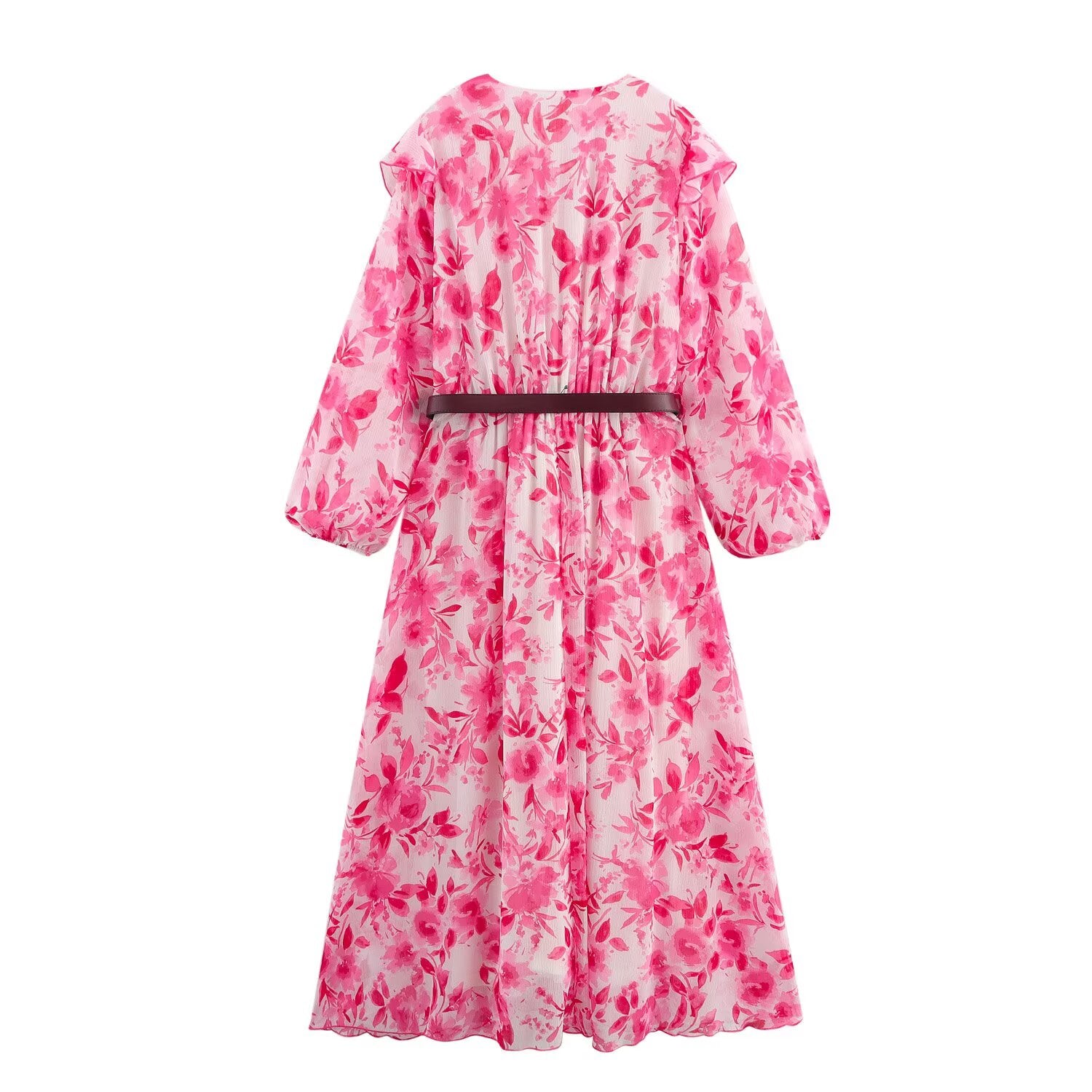Women's new chic fashion With Belt casual layered decoration print V-neck MIDI dress retro long sleeved women's dress