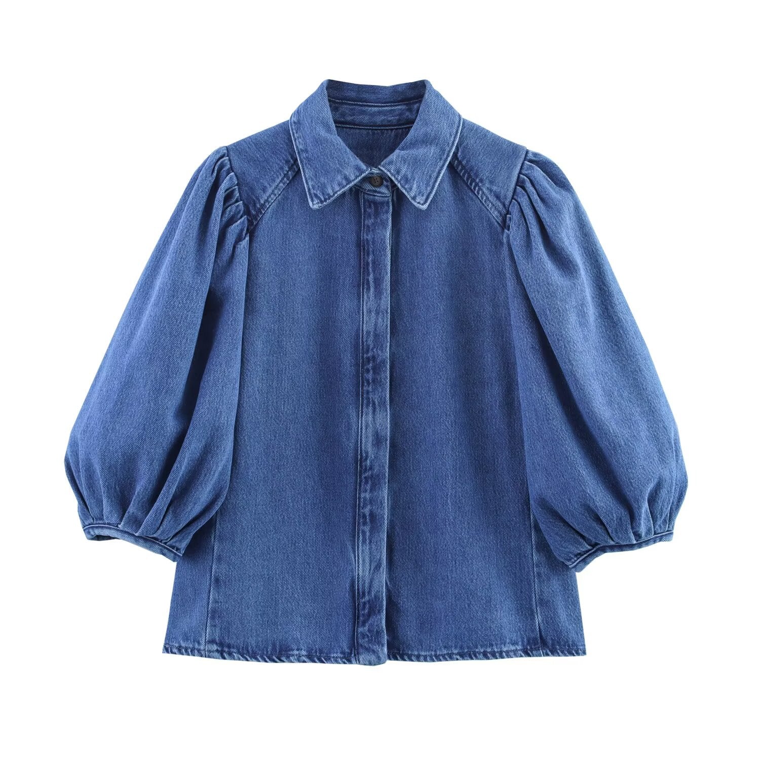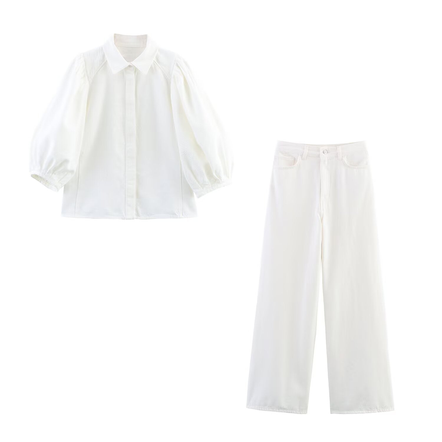Women's' New Fashion bubble short sleeved casual Button-up denim shirt+Jeans Women's suit