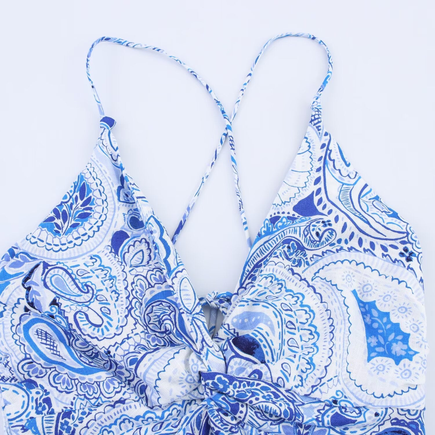 Women's' New Fashion knot decoration slim print V-neck suspender MIDI dress