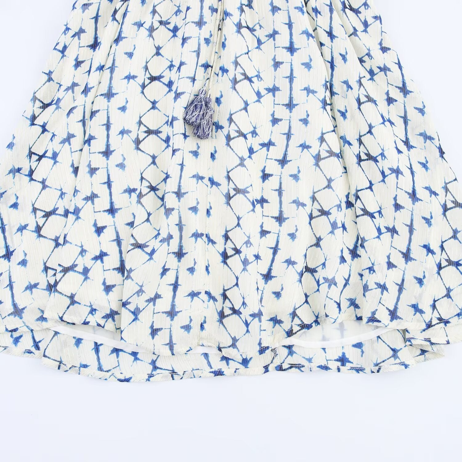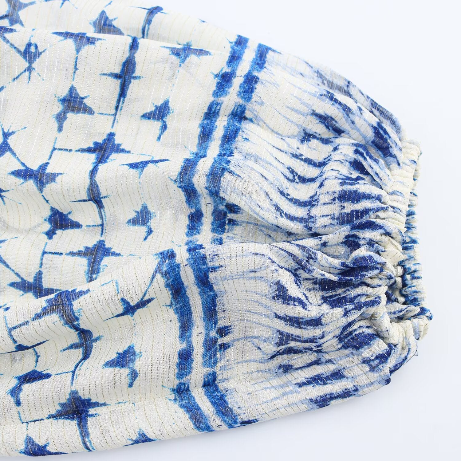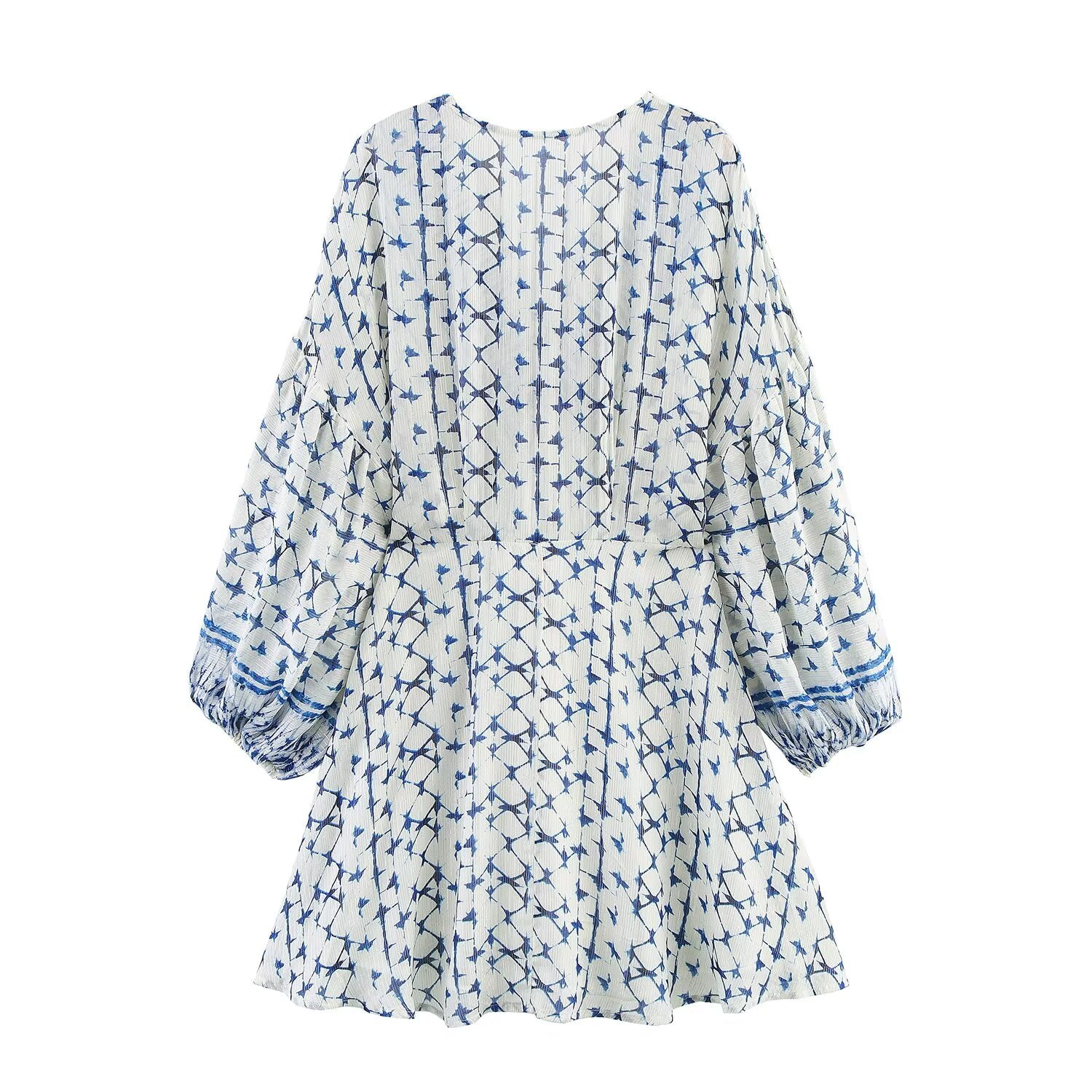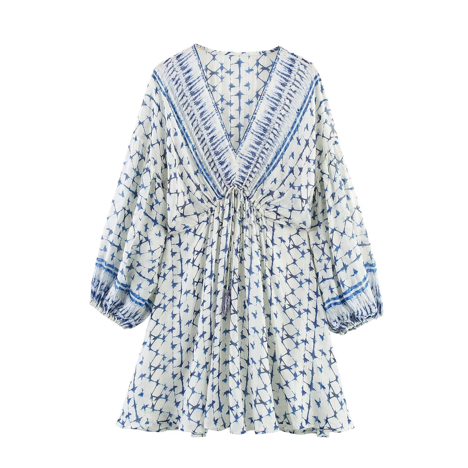 Women's' New Fashion pleated decorative long sleeved printed V-neck mini dress