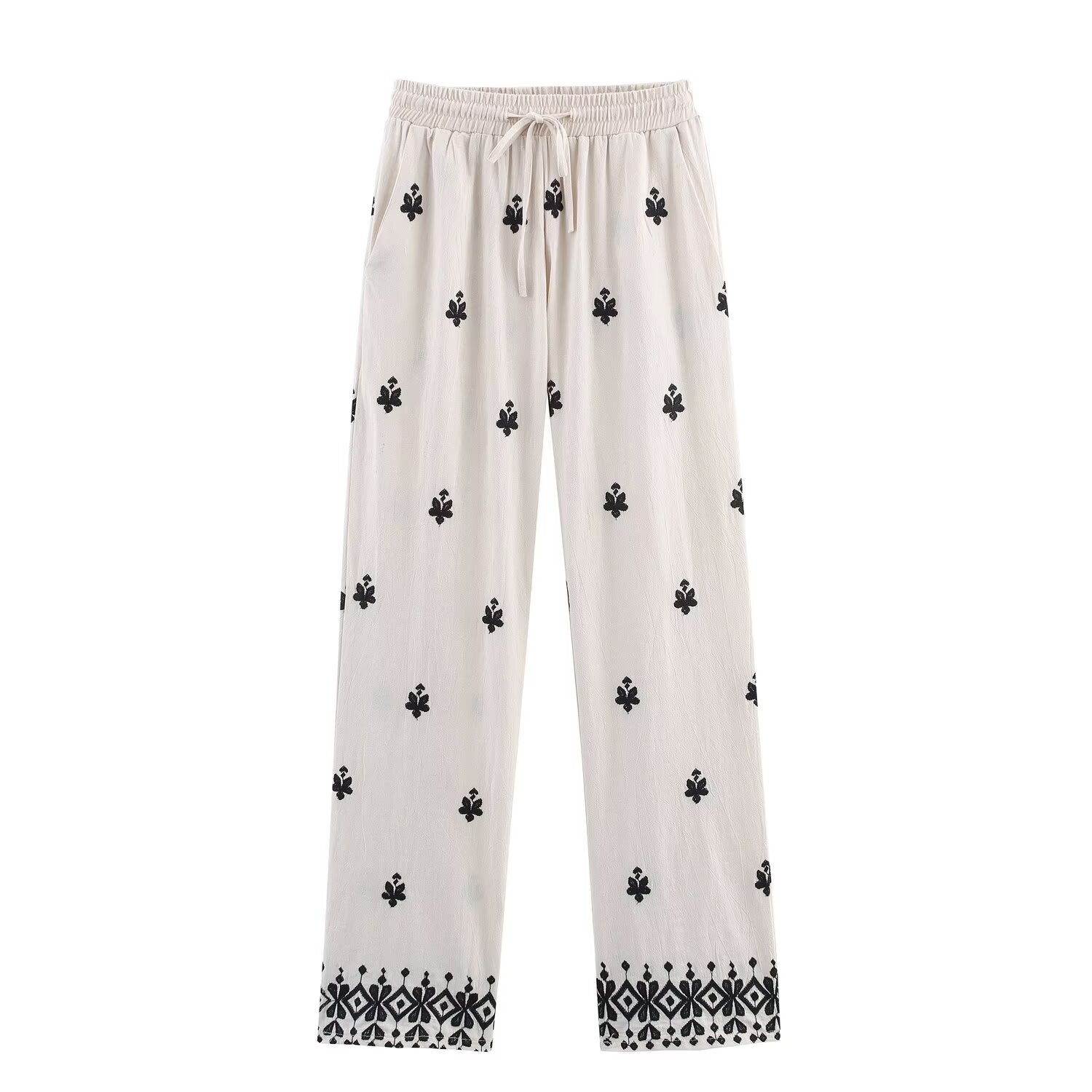 Ladies' New Fashion Drawstring Waist Loose Side Pocket Casual Embroidered Wide Leg Pants