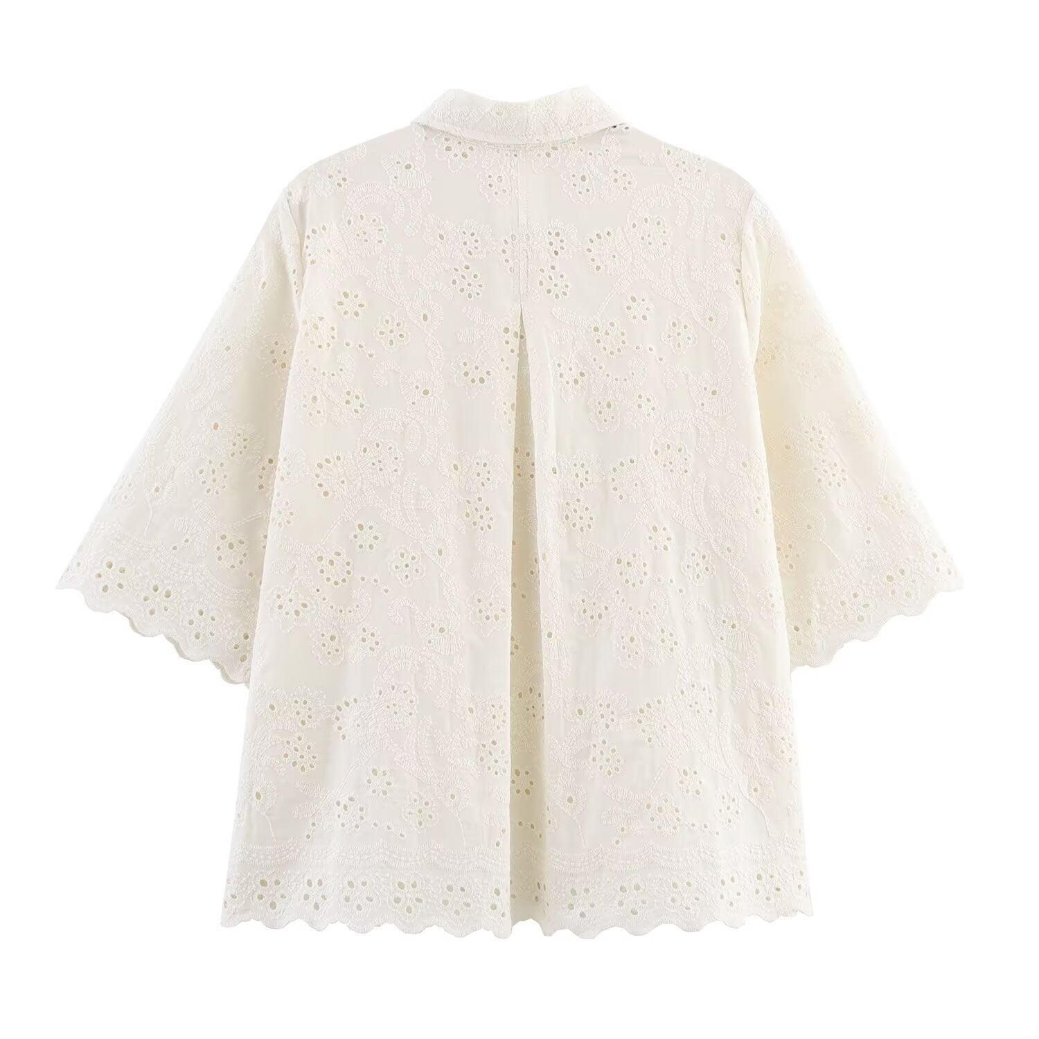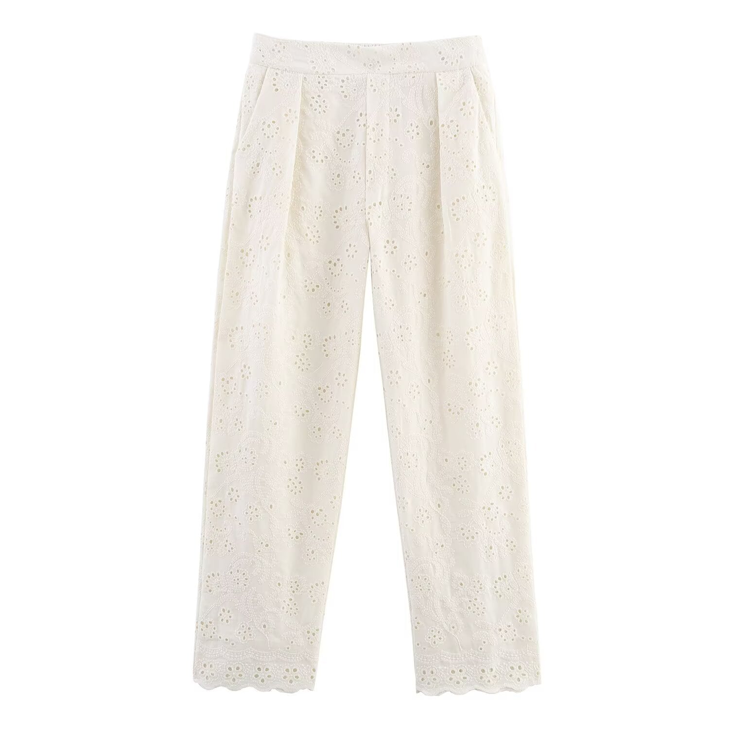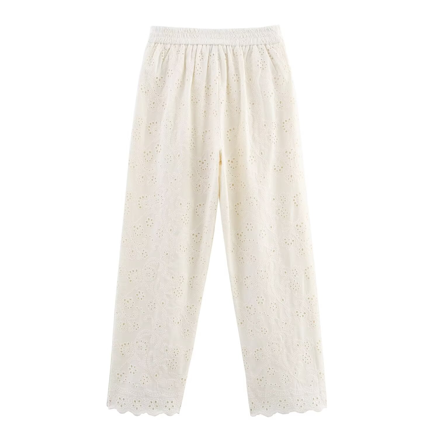 suit Women's 2 pieces New loose short sleeved hollow embroidered shirt + Pants suit