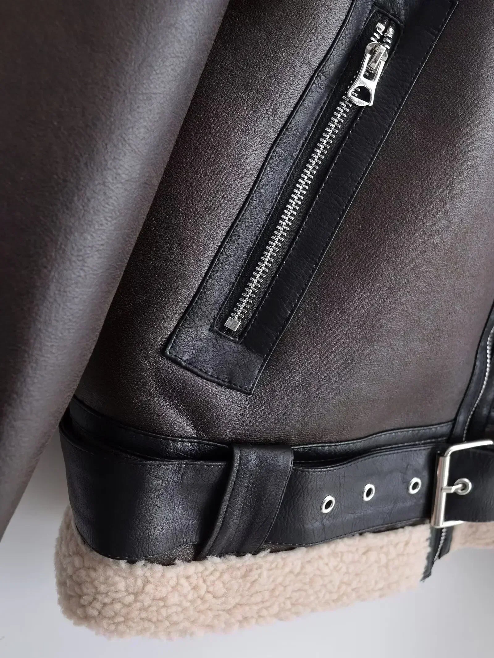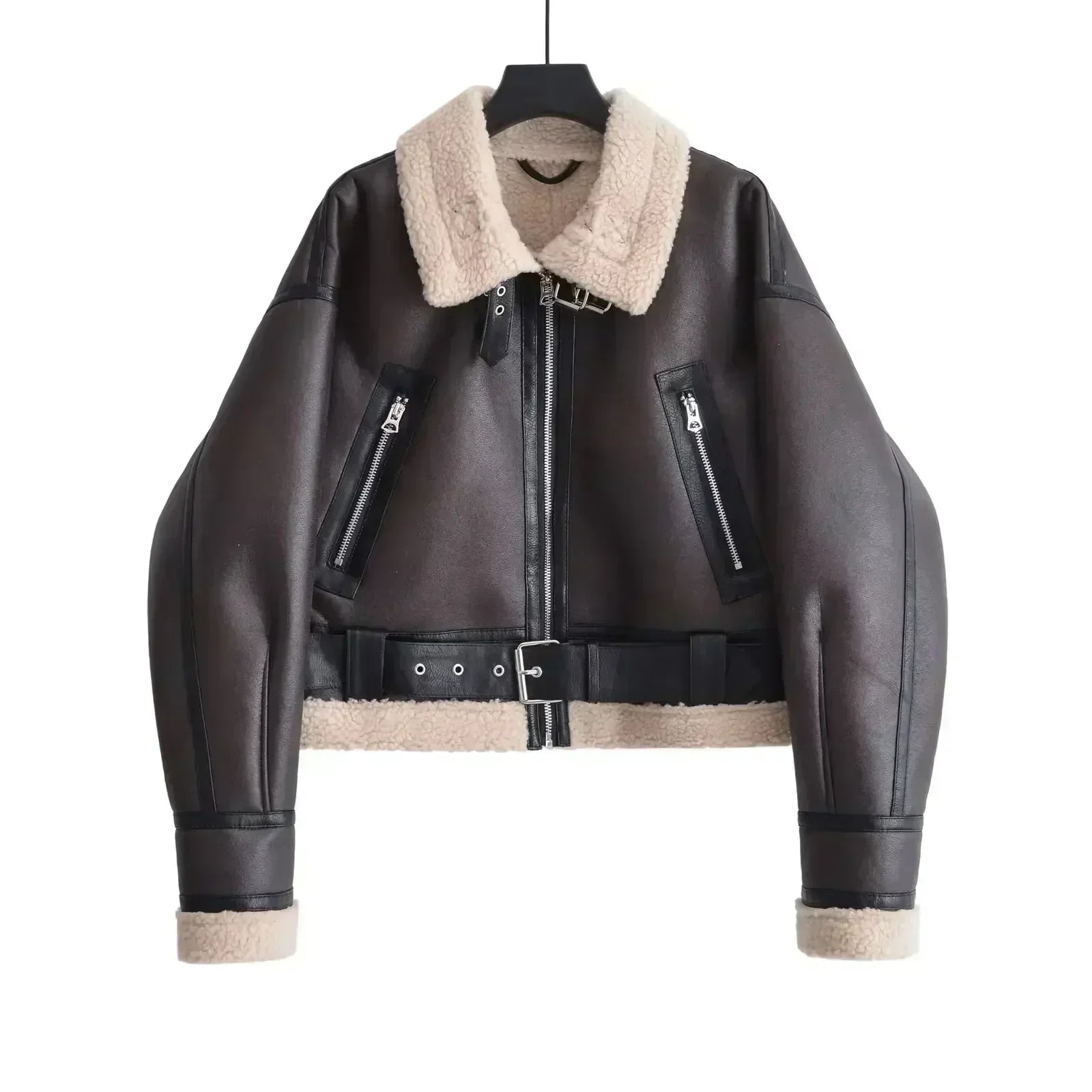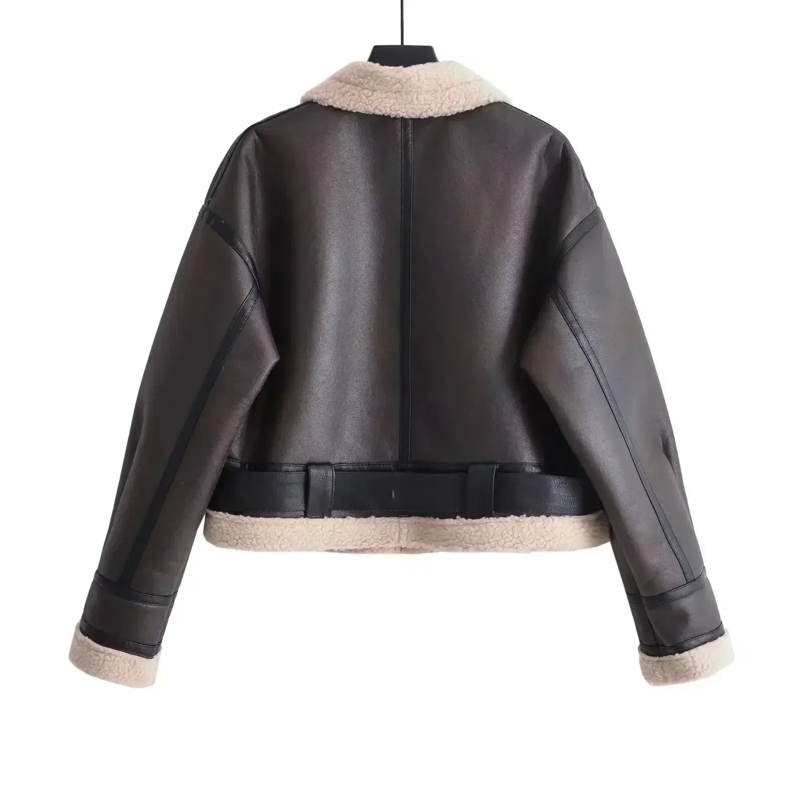 Women 2023 New Fashion Cropped Double sided Fur Faux Leather Jacket Coat Vintage Long Sleeve Zipper Female Outerwear Chic Tops