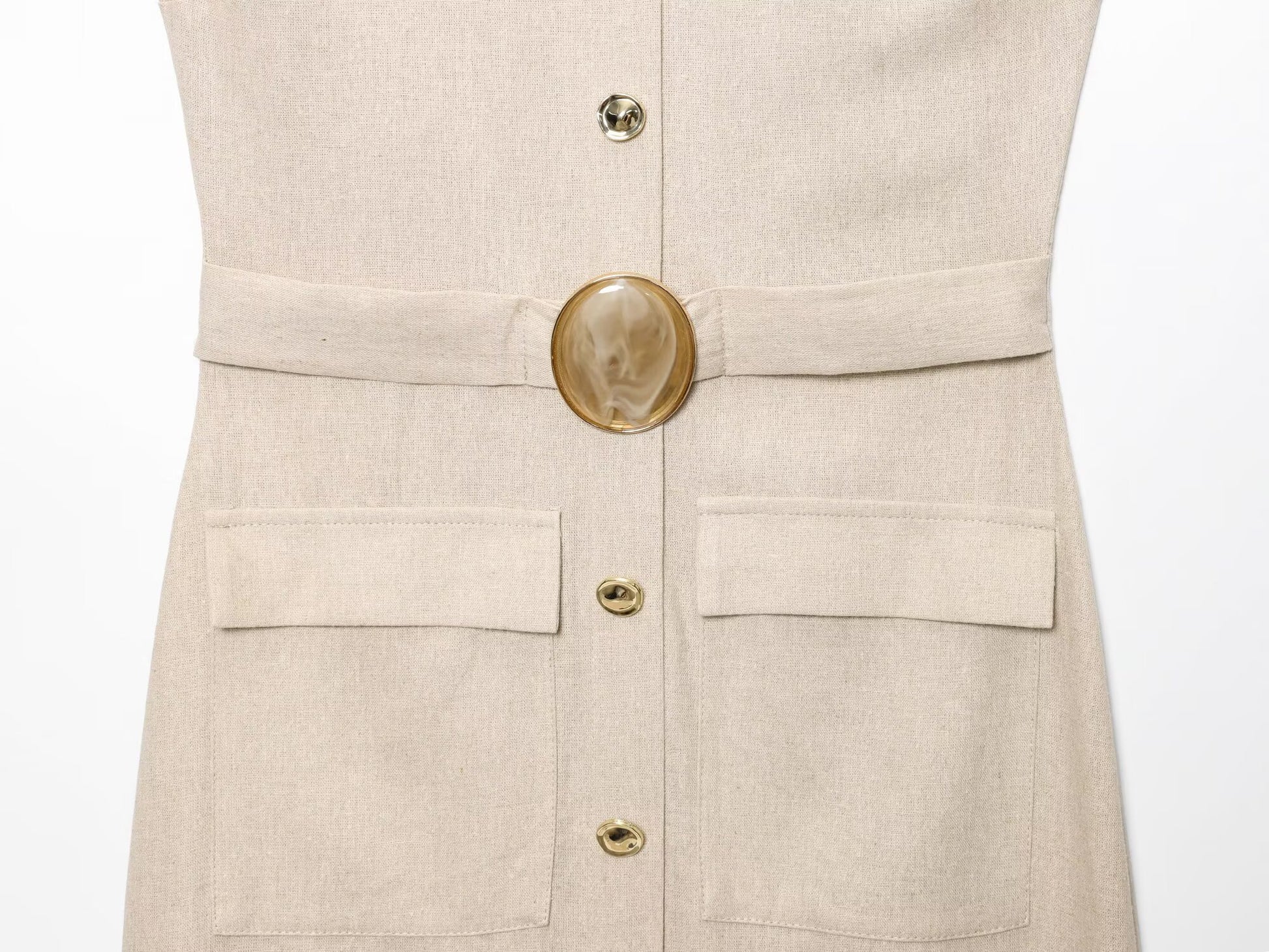 Women's new fashion buckle decoration sleeveless linen blended MIDI dress