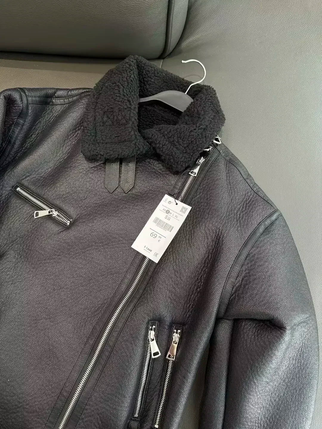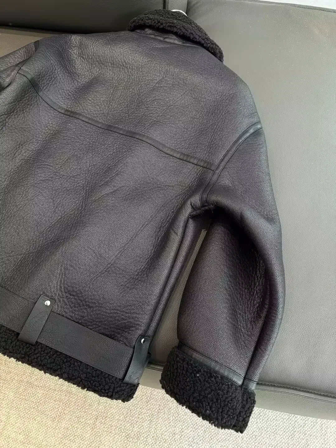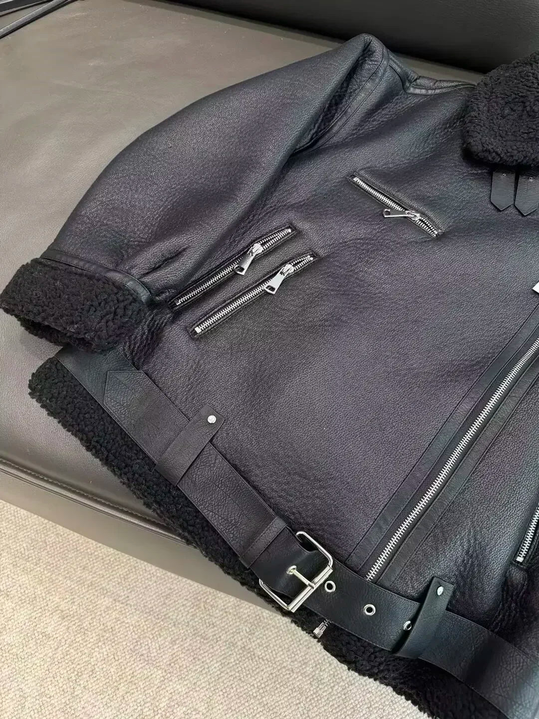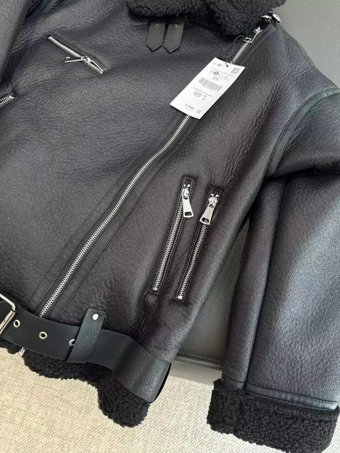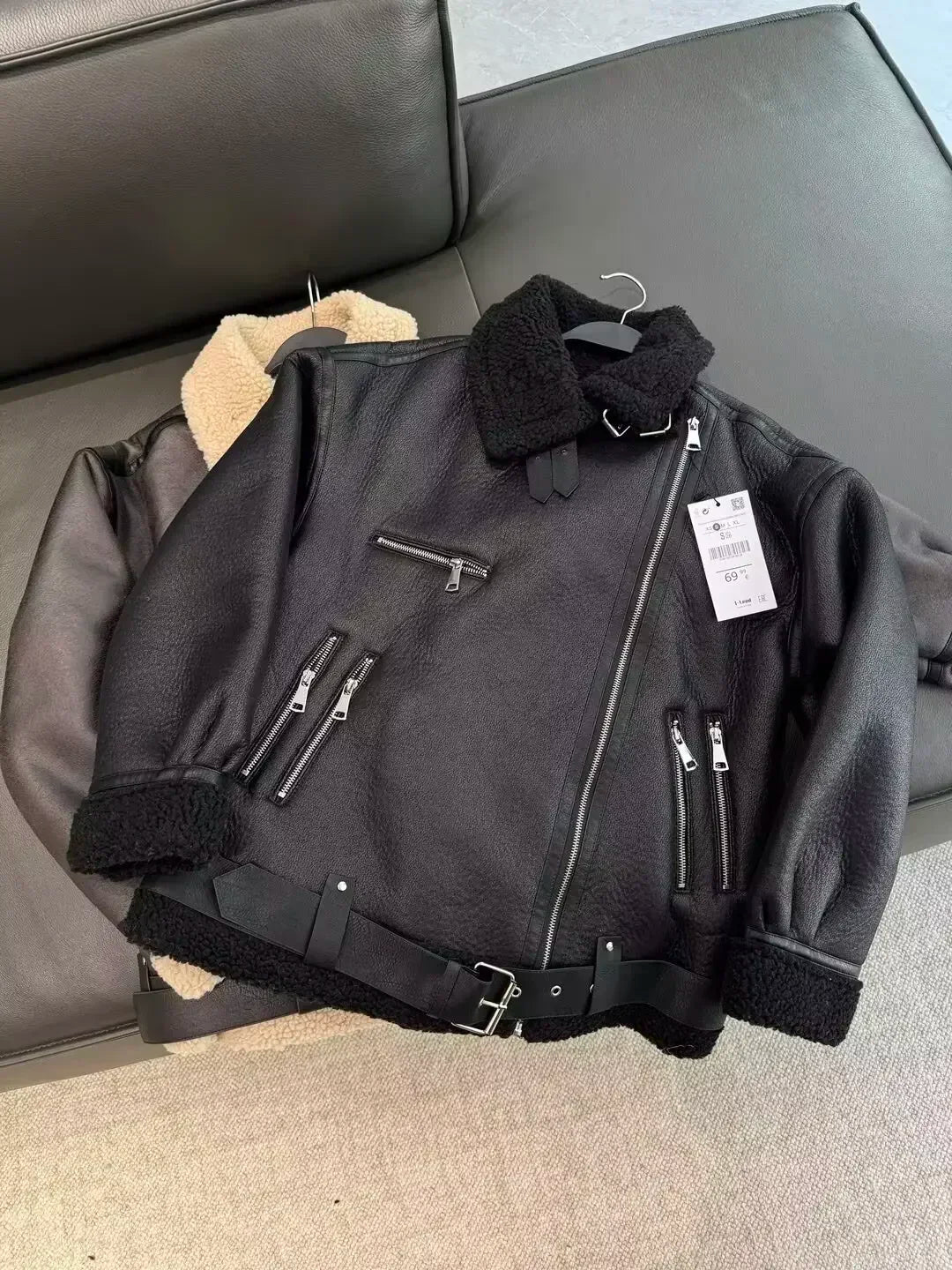 Women's New Fashion Double Zipper Pocket Design Loose Fur Artificial Leather Jacket Coat Retro Long Sleeve Women's Coat Chic Top