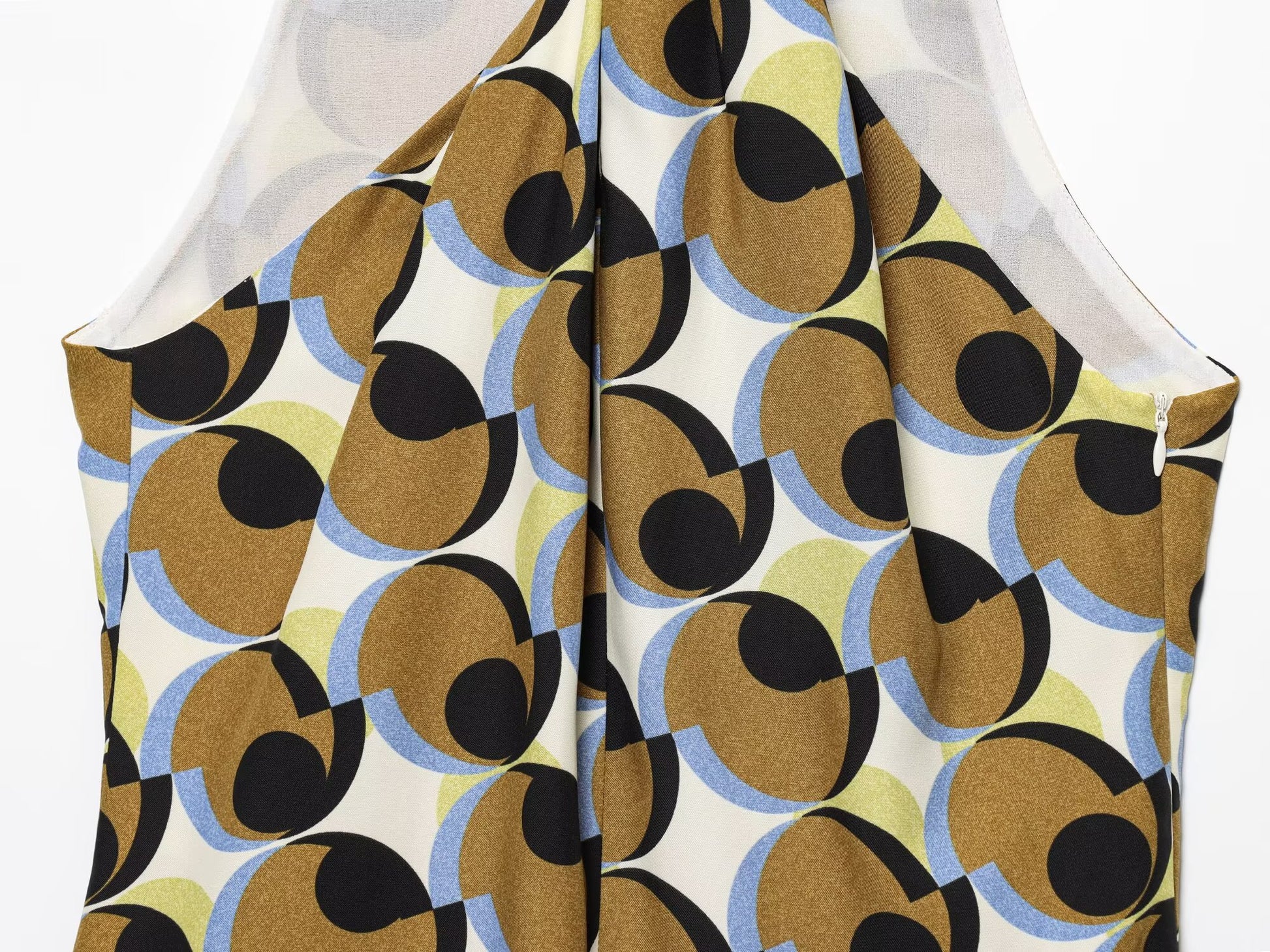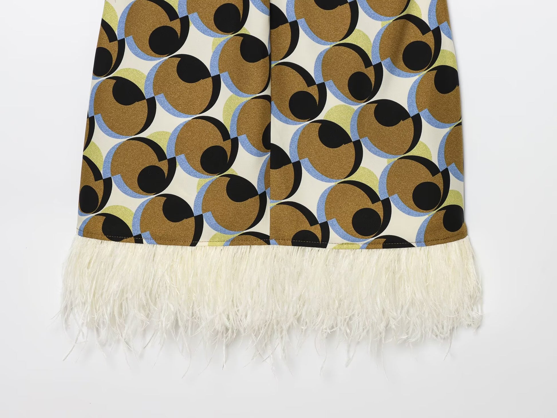 Women's New Fashion feather decoration geometric print hanging neck mini dress