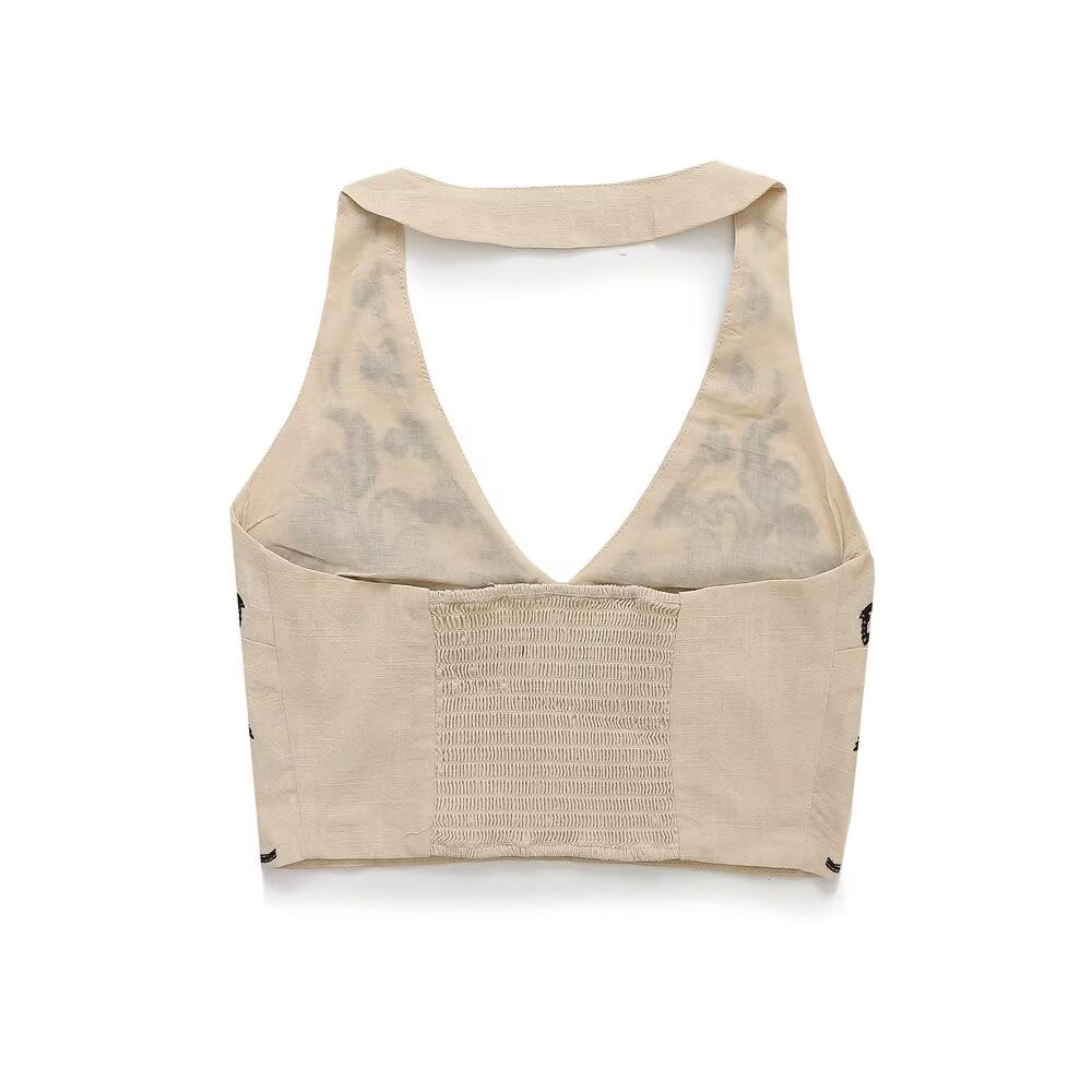 Women's new fashion short embroidered hanging collar top+Skirts suit