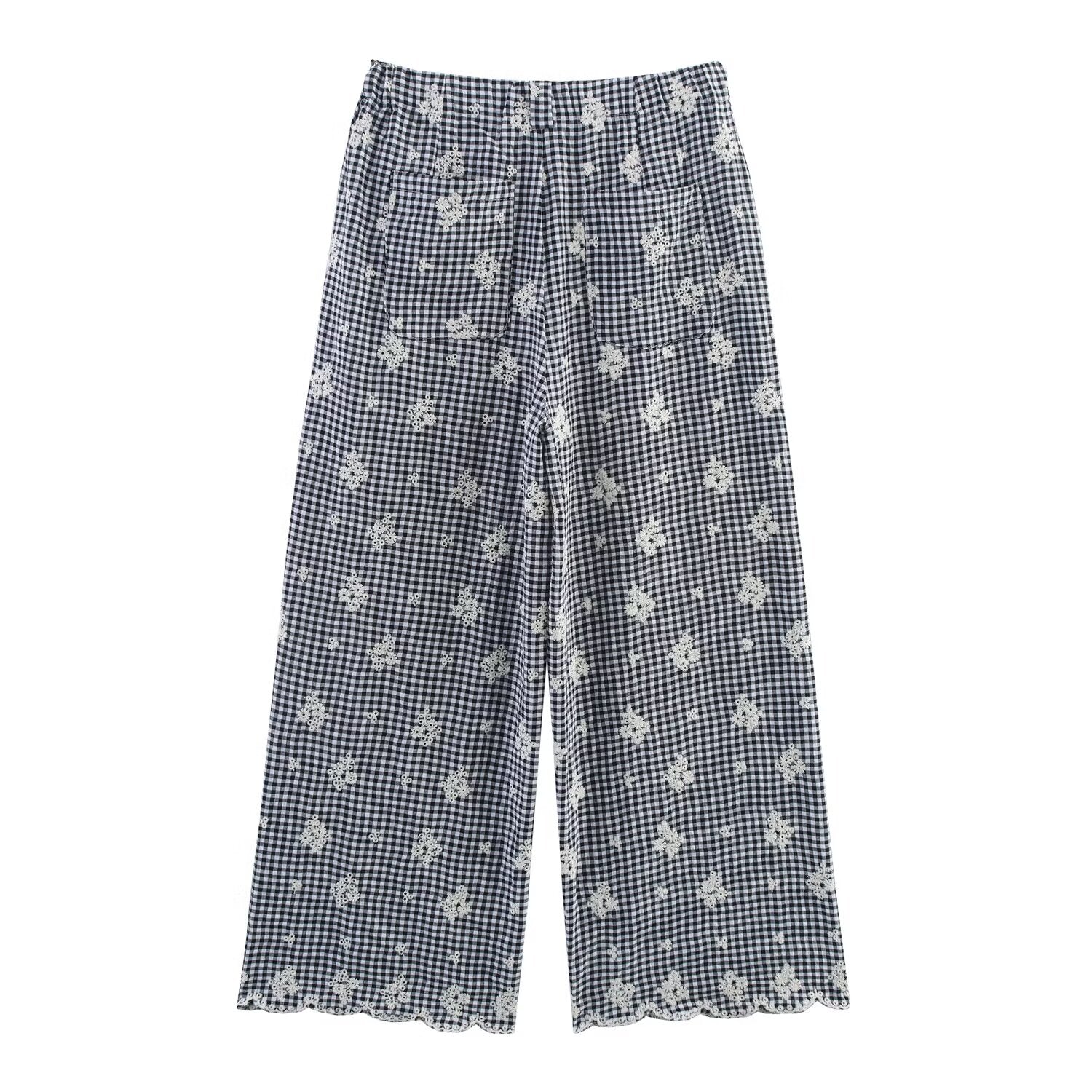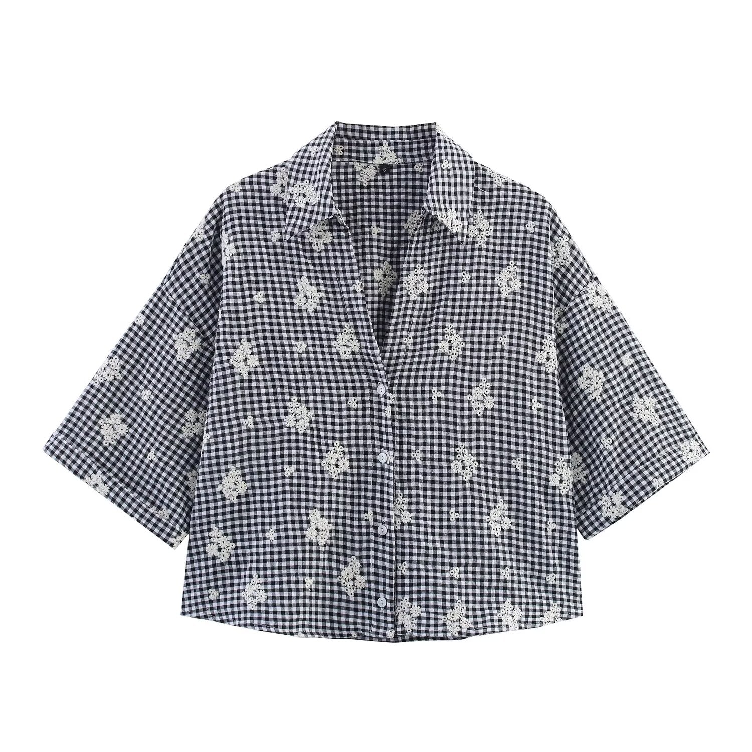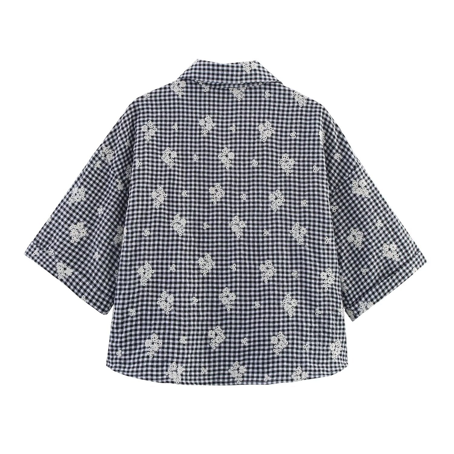 Women's new fashion short sleeved embroidered Plaid shirt+Pants suit