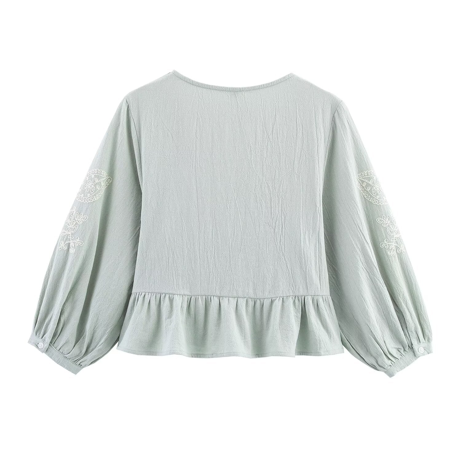 Women's new fashion vacation style long sleeved V-neck embroidered top