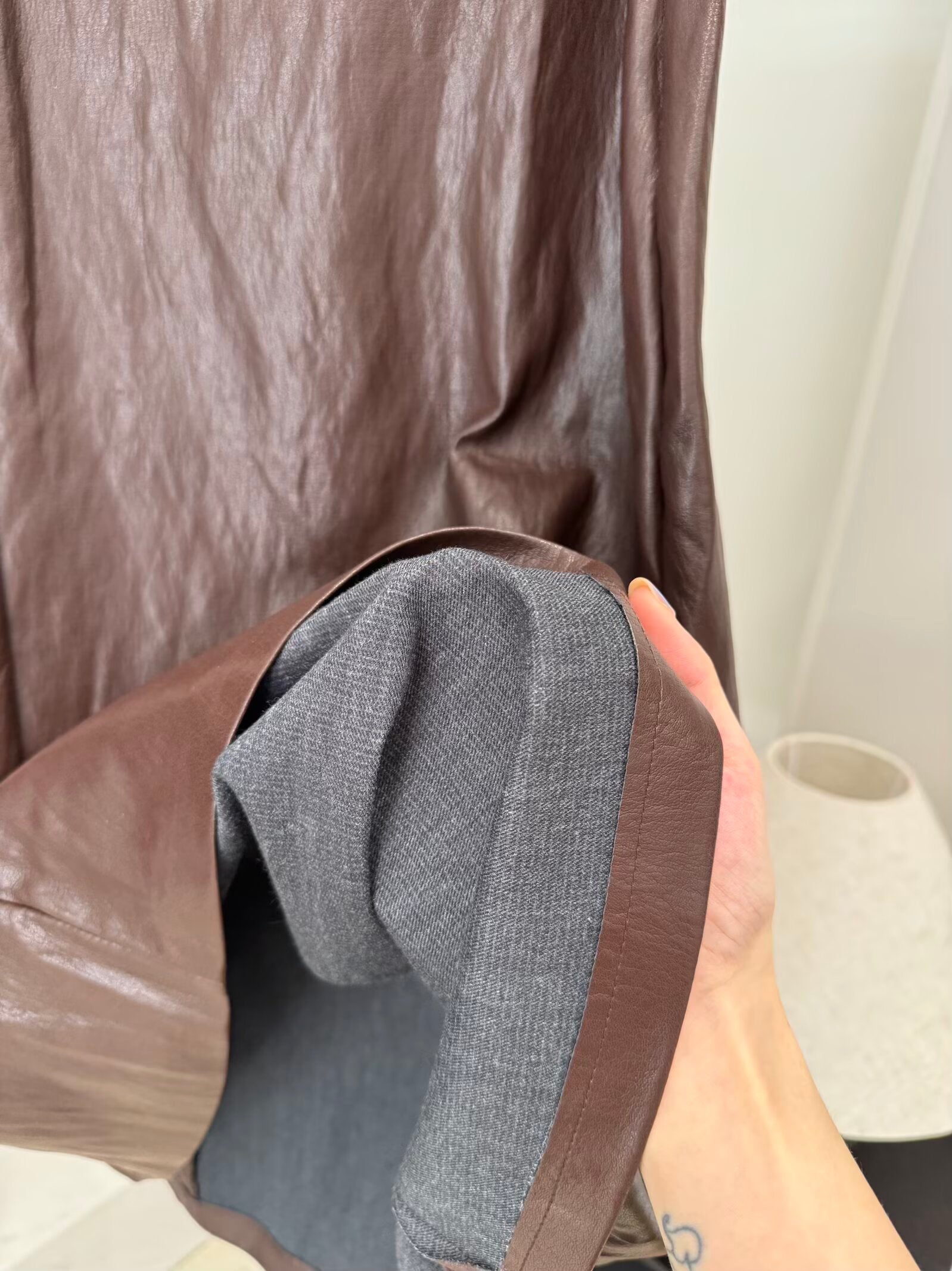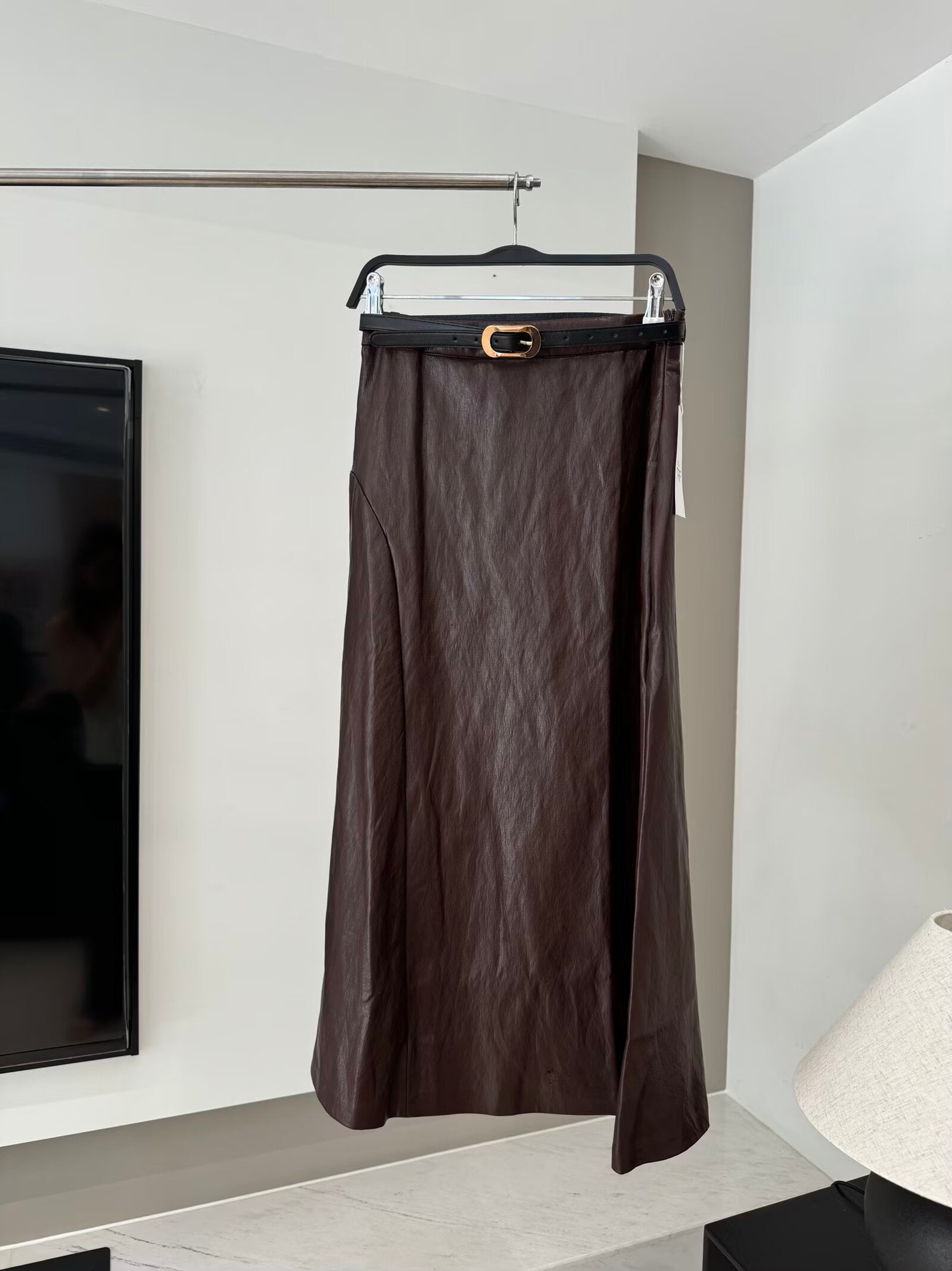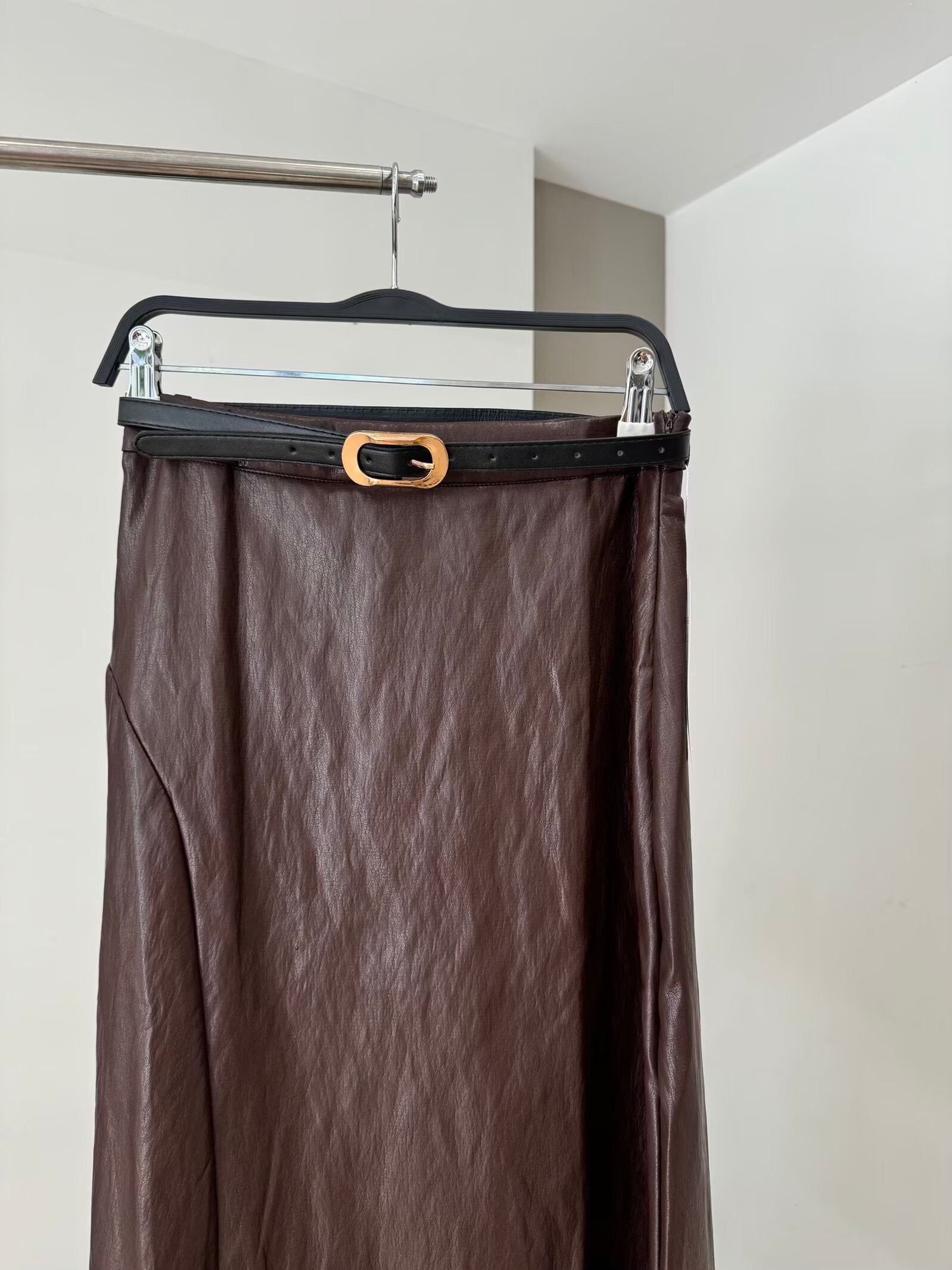 Women's New Fashion With Belt Casual Leather Effect Midi Skirt