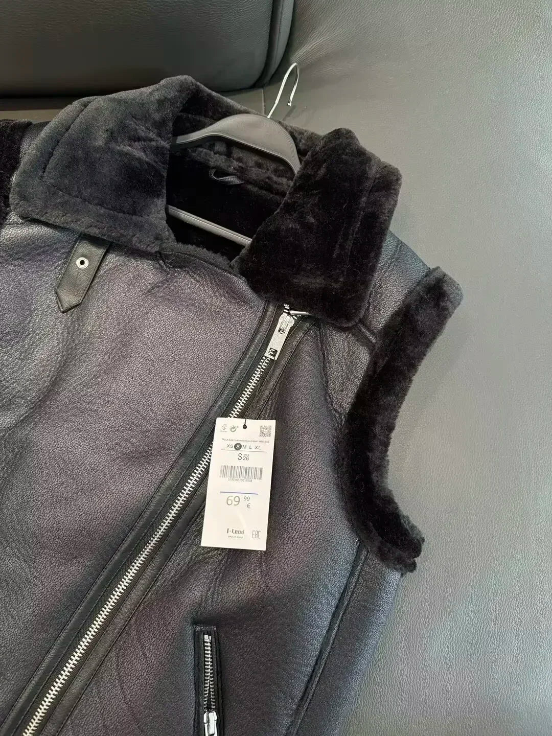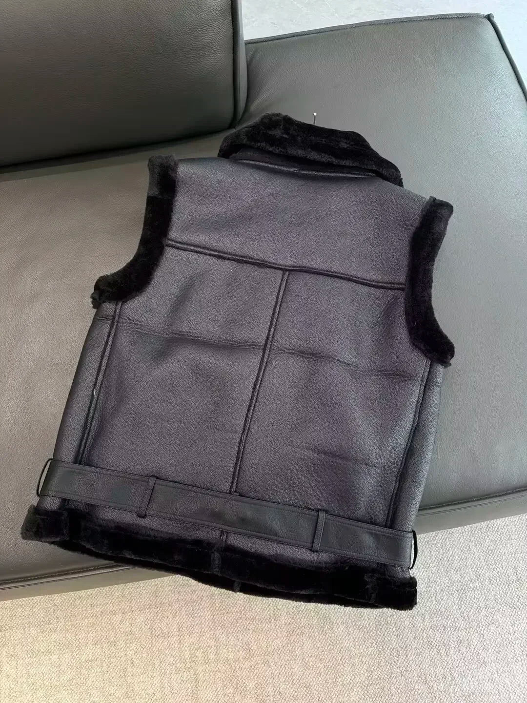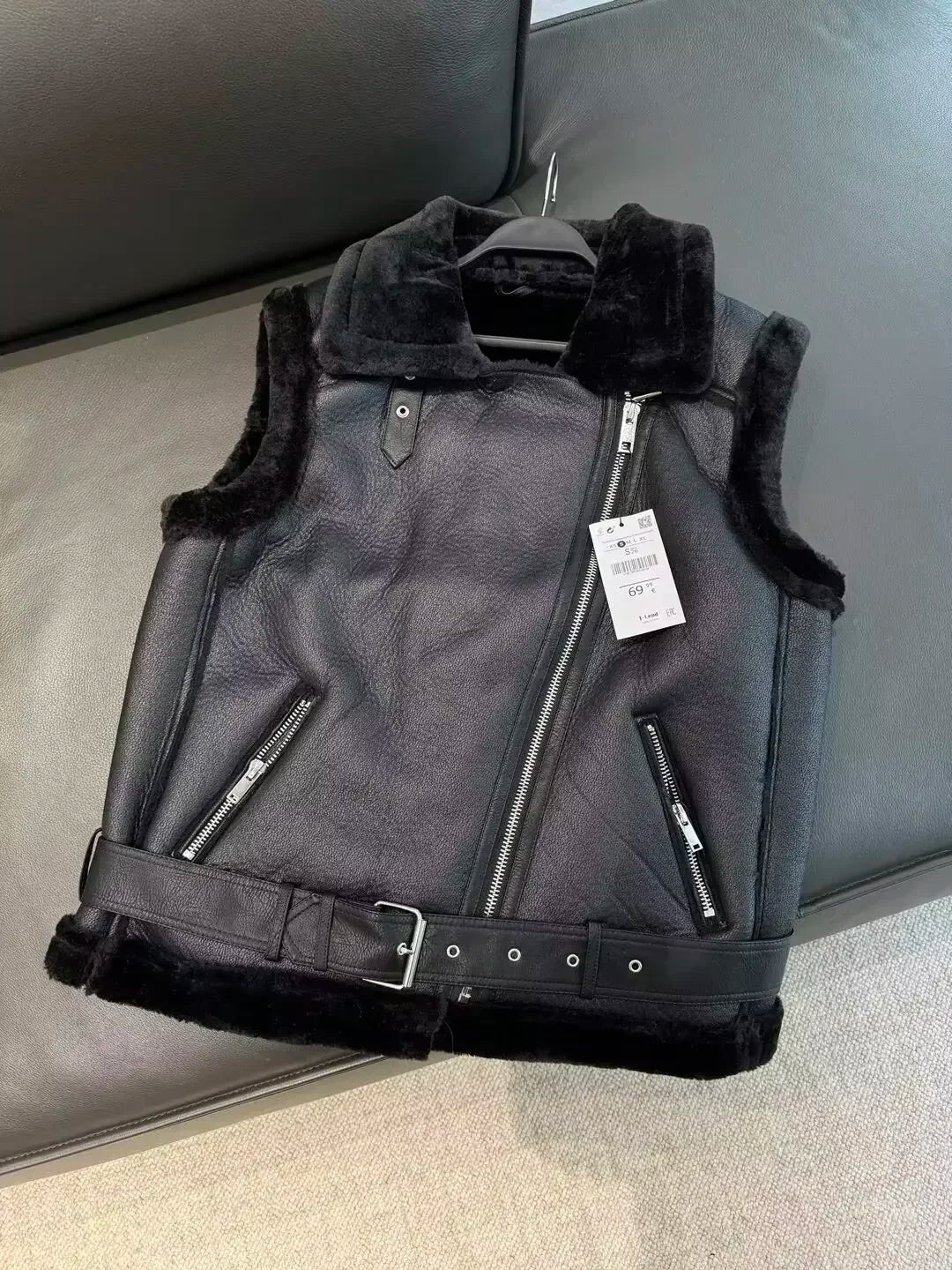 Women's new fashion With Belt loose side pockets casual Fur Faux Leather vest coat retro sleeveless zipper women's vest chic top