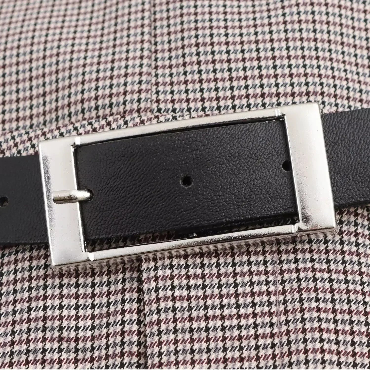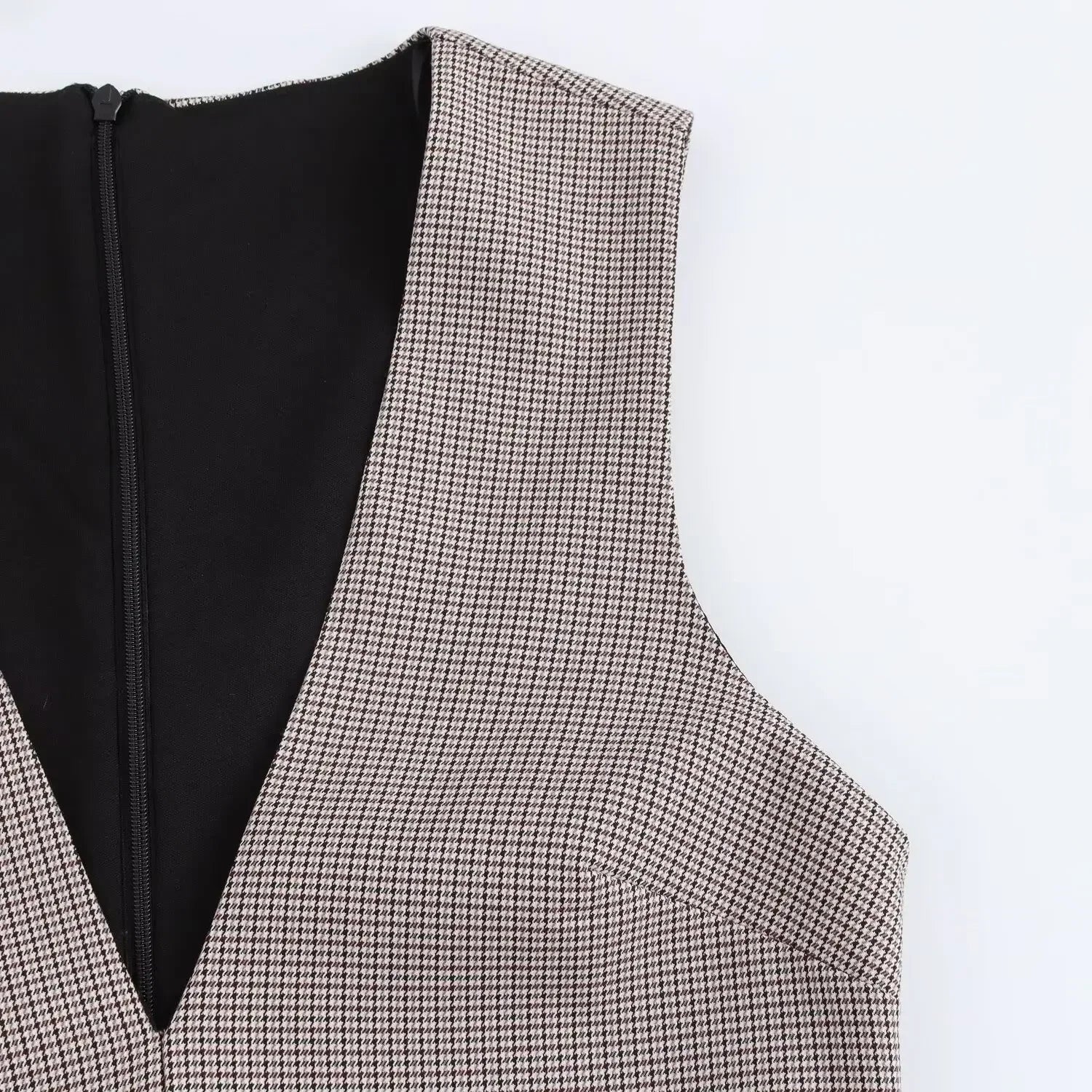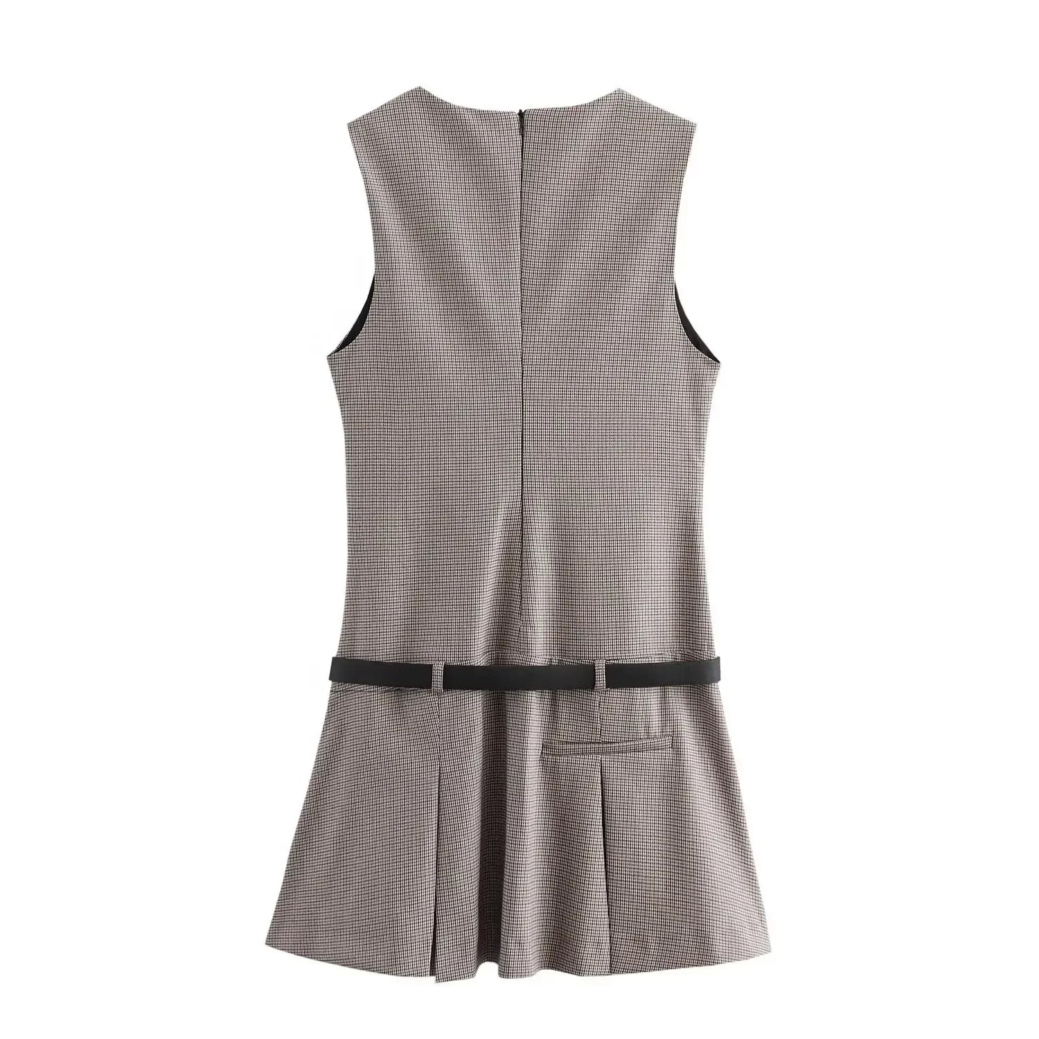 Women's new fashion with Belt wide pleated hem Design slim plaid mini dress retro V Neck sleeveless women's dress Mujer